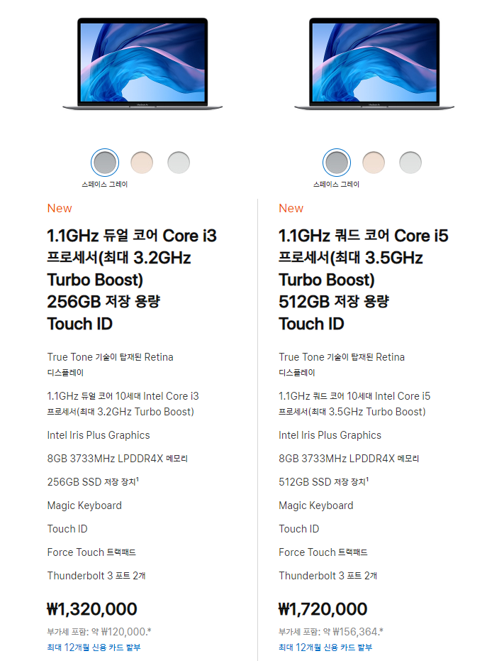 이제 기본 저장용량 256GB로 시작하는 새로운 맥북에어를 시작가 132만원, 교육할인시 118만원대에 구입할수 있어요. 2019년 버전의 기본구성에 128GB와 다르지 않은 가격이죠. 아마 그럴 분은 없겠지만 CTO 주문시 i7 프로세서까지 탑재 가능해서 맥북프로와 다른점이라곤 터치바를 제외하고는 찾기 어려운 수준까지 따라왔습니다.