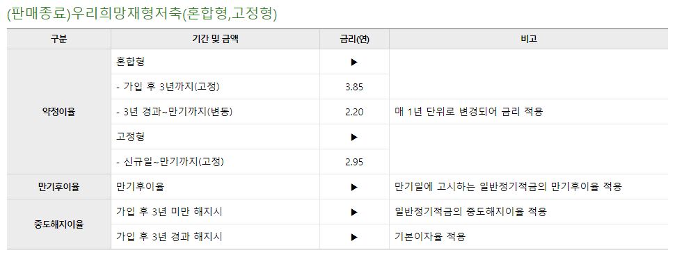 지금은 가입할래야 가입할수 없는 재형저축은 2013년 3월부터 2015년 12월 말일까지만 한시적으로 판매 후 중단했던 고금리 상품인데요, 혼합형과 고정형으로 가입 가능했었어요. 2015년까지만 해도 은행금리가 지금보다는 훨씬 높던 시절이라 고정형으로 가입하는 분들은 거의 없었는데, 지금의 2020년처럼 초저금리가 올줄 알았으면 저도 그때 3% 고정금리로 가입할걸 그랬다는 생각이 가끔 듭니다. 혼합형은 초기 3년간은 약 4.5%전후의 고금리를 지금하고 이후에는 시장금리에 따라 변동되는데, 취급하는 금융기관마다 다르지만 현재 혼합형 재형저축의 금리는 우대금리 포함해서 2.5% 전후에 불과합니다.