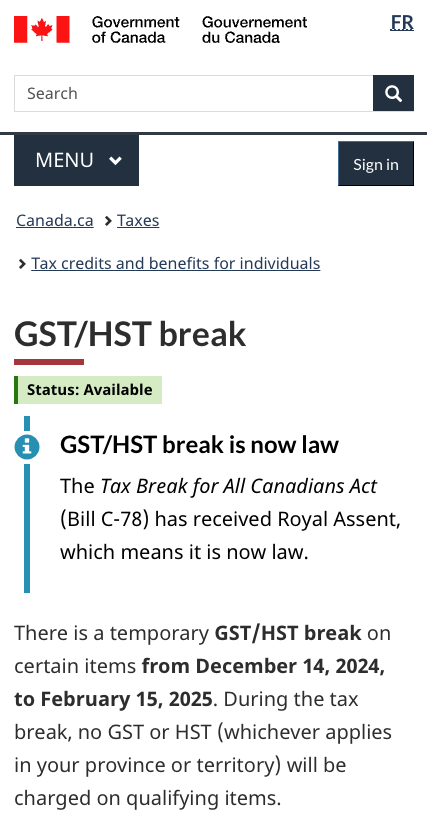 캐나다 정부는 2024년 12월 14일부터 2025년 2월 15일까지 특정 품목에 대해 GST/HST 면세 혜택을 제공하는 임시 세금 감면 조치를 발표했습니다. 이 조치는 주로 휴일 동안의 재정적 부담을 덜어주기 위한 목적으로 시행되었습니다.